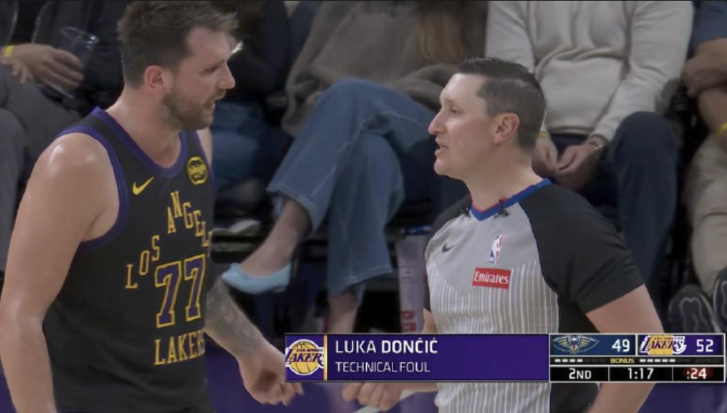 In the second quarter of yesterday's Lakers vs. Pelicans game, Doncic had two free throw chances. During the first attempt, he felt an opponent violated by entering the lane early, but the officials did not award a re-do. After sinking the second free throw, Doncic spoke to the referee, resulting in a technical foul.