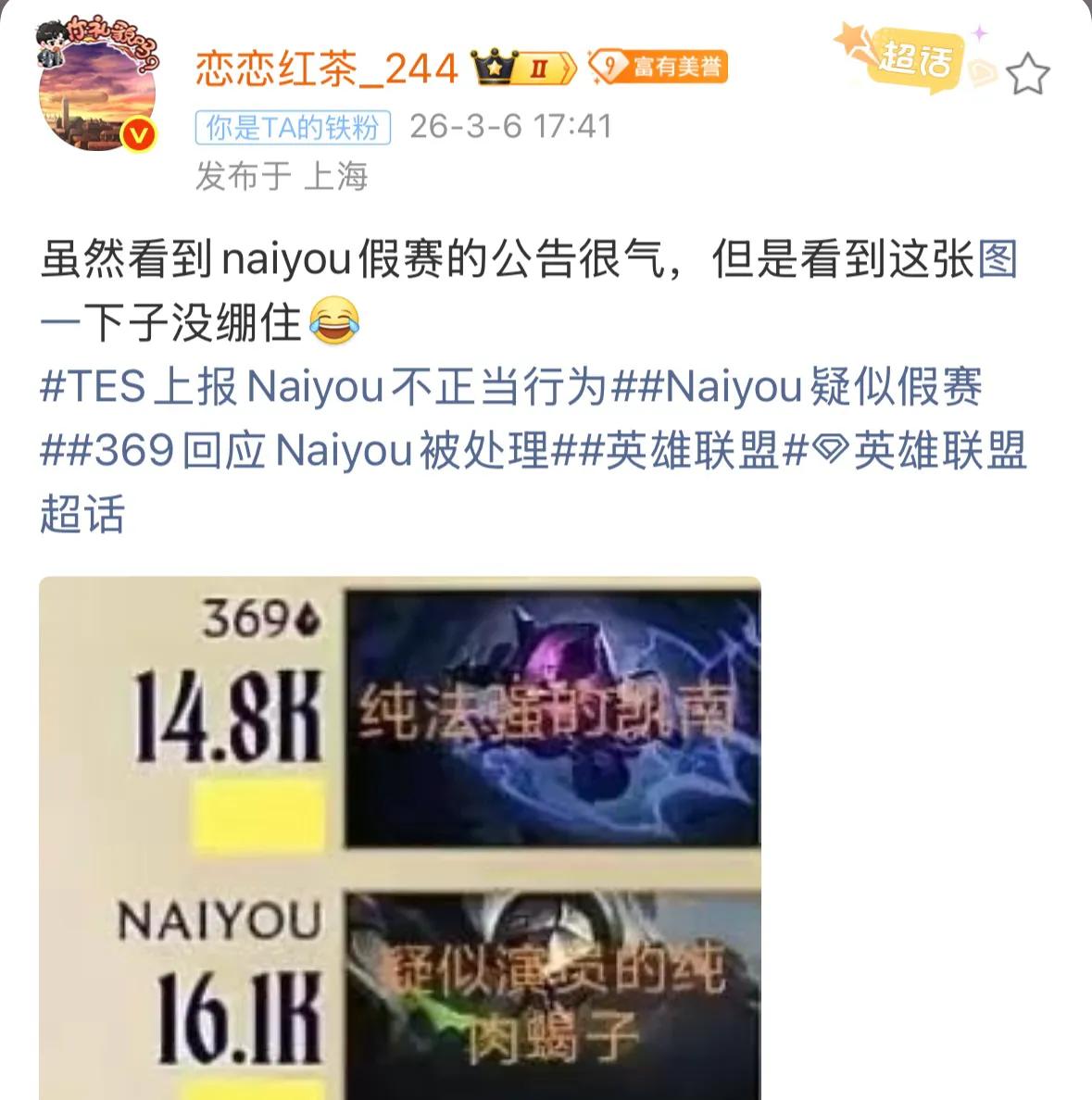 Introduction: The S16 season competition has officially begun, and it is believed most players have been following the recent matches. The LPL regional matches are about to conclude. Originally, we thought there wouldn't be much news during this period, but unexpectedly, TES team issued an announcement stating that their jungler player Naiyou has been disclosed to have engaged in improper competitive behavior. It was initially thought to be the club's initiative, but it turns out it was due to player threats. Both the AD player and mid-lane player approached the club, indicating that if the club did not investigate, they would report directly to the league. Industry insider Zuowu even publicly stated during a live stream that Naiyou's Green Armor Scorpion was fine, and that match was clean.