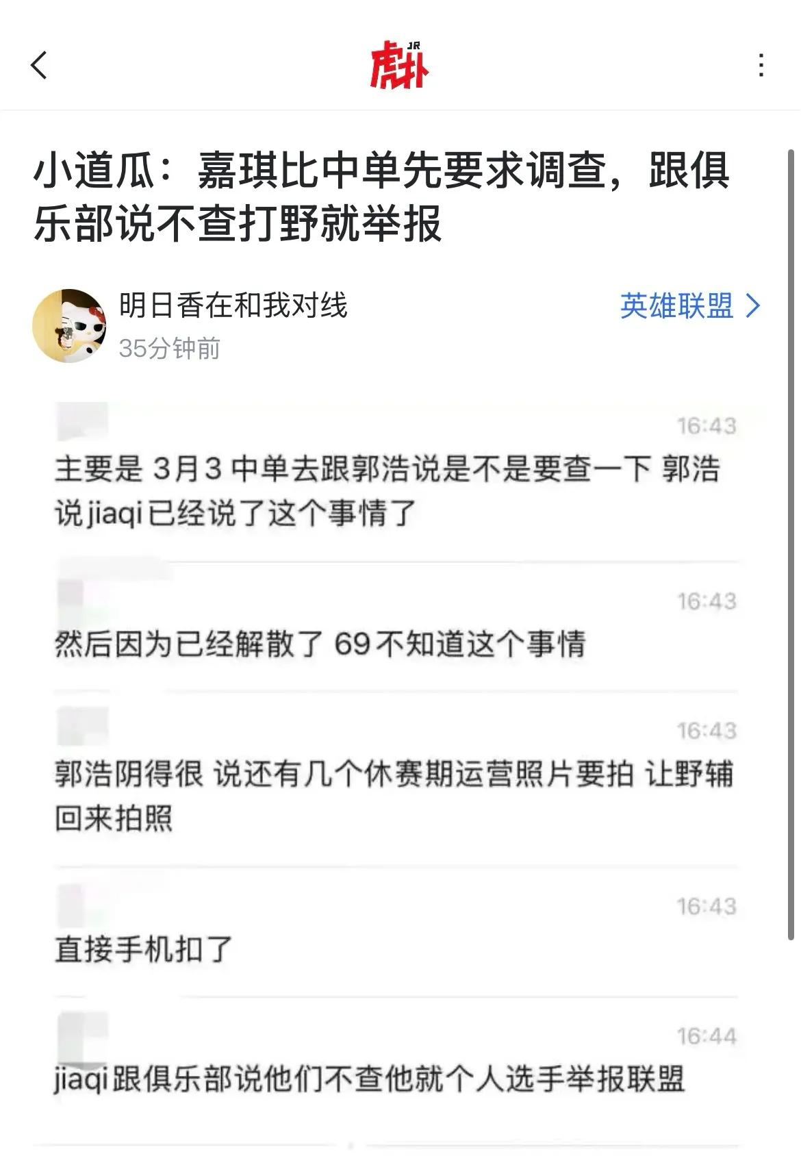 According to netizen revelations, this investigation was not initiated actively by TES management. After the March 3rd match ended, mid-lane player Little Cream and team manager Guo Hao discussed whether to investigate the result. Guo Hao directly told him AD Jiaqi had already mentioned this matter, and not only the jungler was investigated, but apparently the support as well. Jiaqi essentially threatened TES team management, stating that if the club did not investigate, he would report directly to the league as an individual player. Honestly, Little Cream proposing this idea is understandable, as he was the most dedicated among them and also the most regretful one; unexpectedly, AD was the first to raise it.