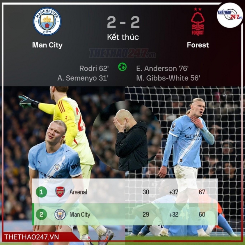 Manchester City drew 2-2 with Nottingham Forest at Etihad in the 29th round of the Premier League, in a match where they twice took the lead. This result caused the Sky Blues to drop crucial points, allowing Arsenal to extend their lead to 7 points at the top of the table, although City still have a game in hand.