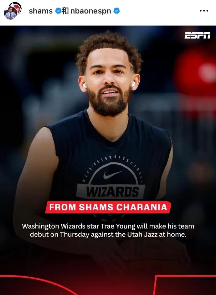 According to a report from insider Shams Charania,Trae Young is set to make his Wizards debut this Friday in a home game against the Jazz.Wizards head coach Keefe confirmed the news, stating that Young is expected to play around 17-20 minutes.