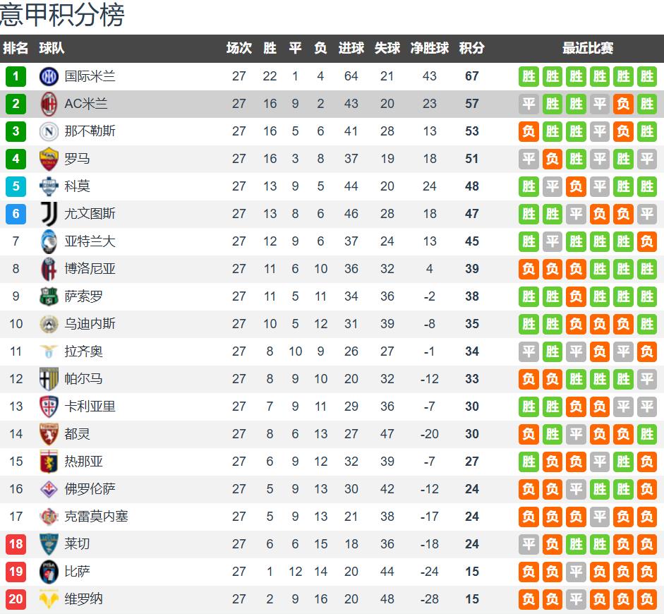 Serie A has played 27 rounds, leaving 11 matches this season. Inter Milan leads by 10 points, with AC Milan in second place, making the Serie A title race essentially devoid of suspense. After being eliminated from the Champions League playoffs by Bodø/Glimt, Inter has focused solely on securing the domestic league, a 10-point gap that other teams cannot overcome.